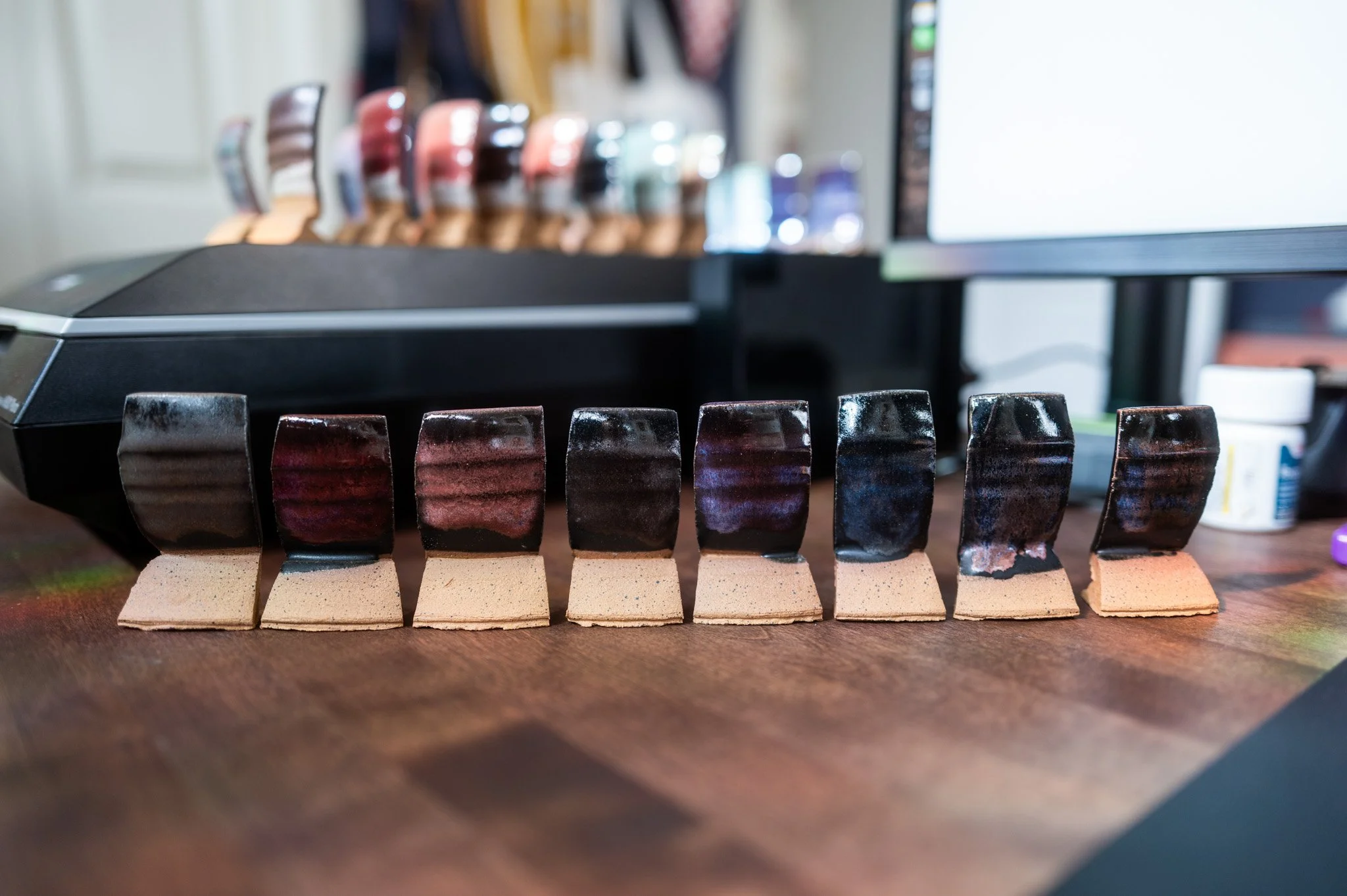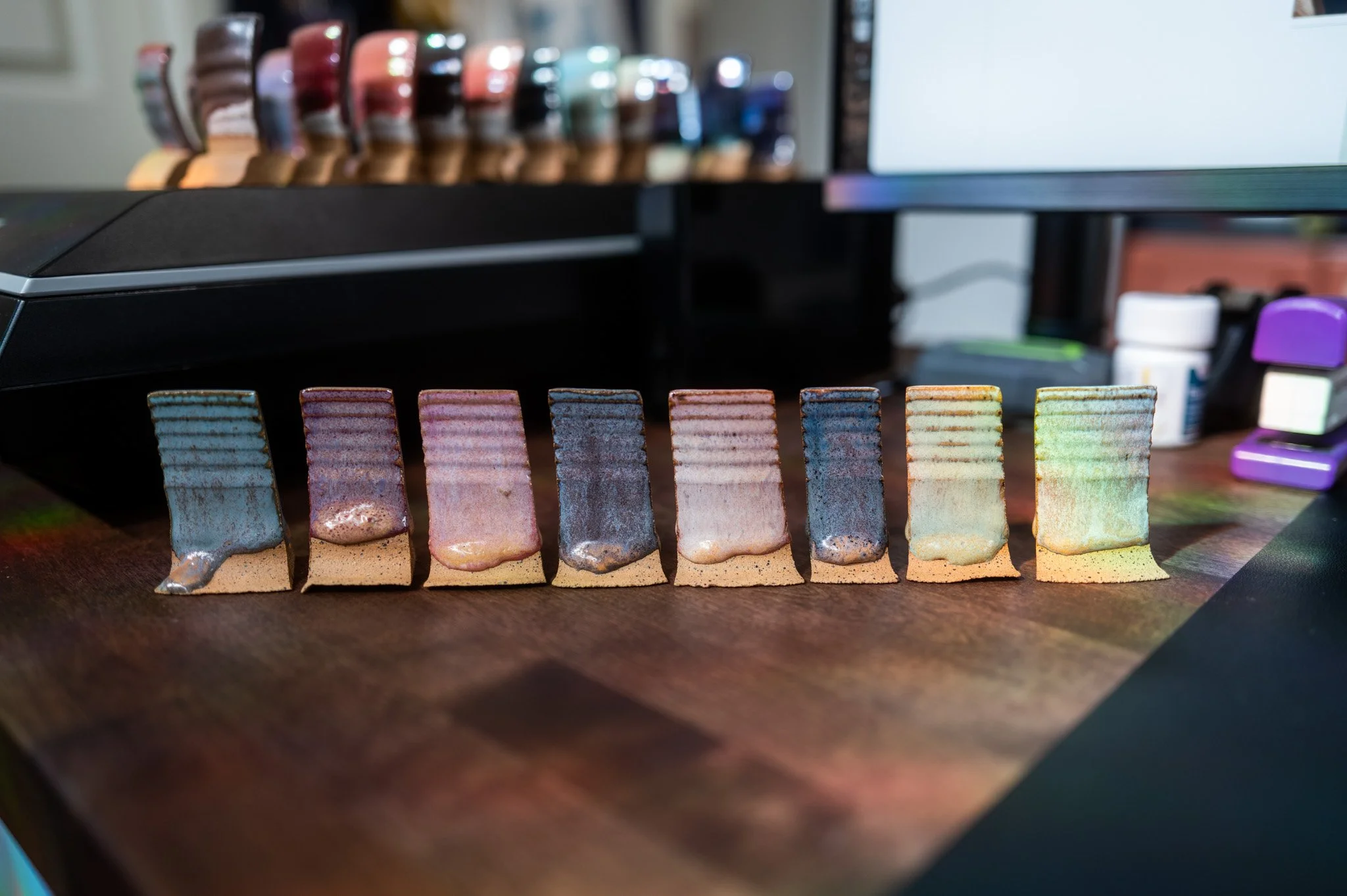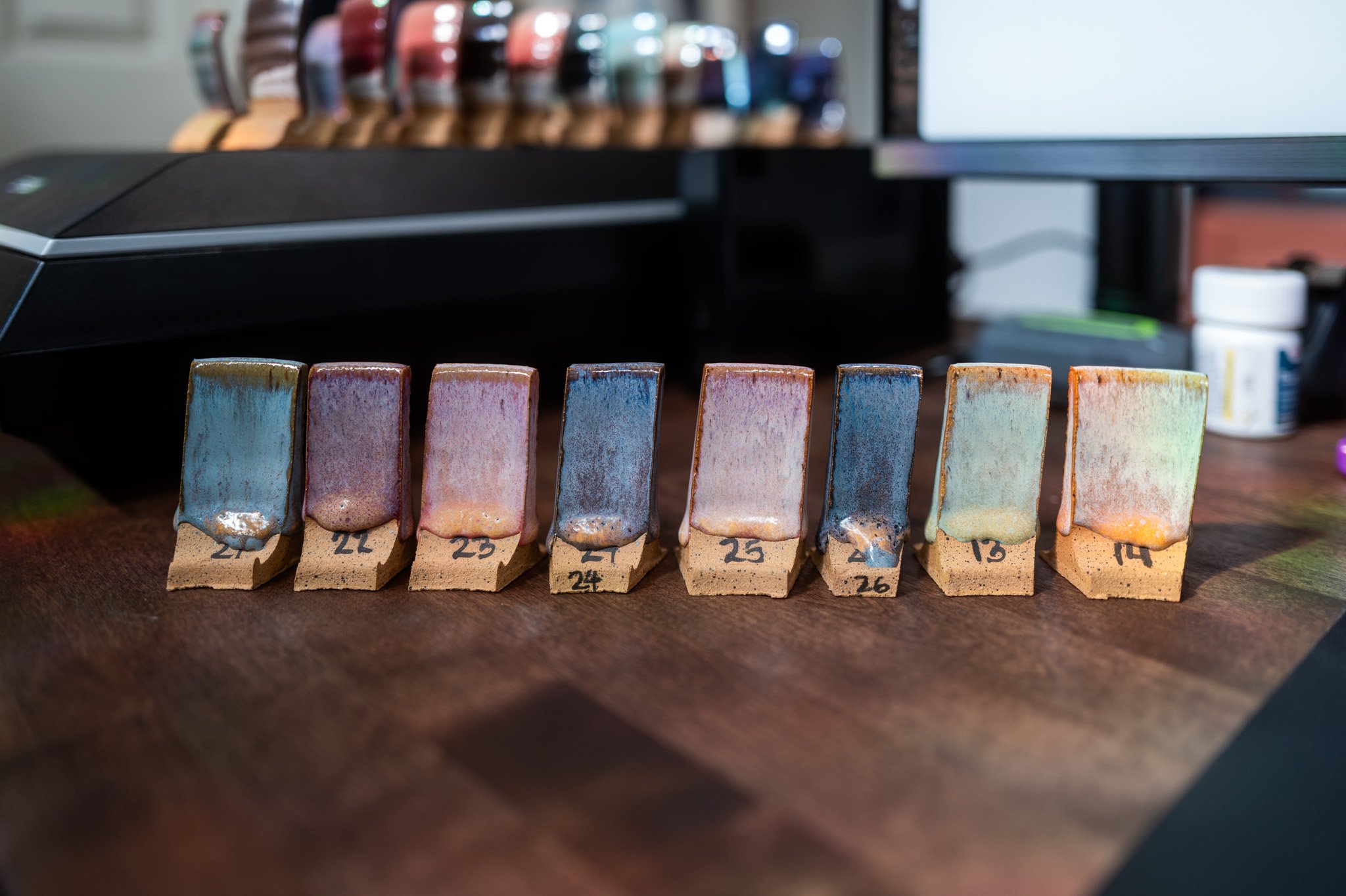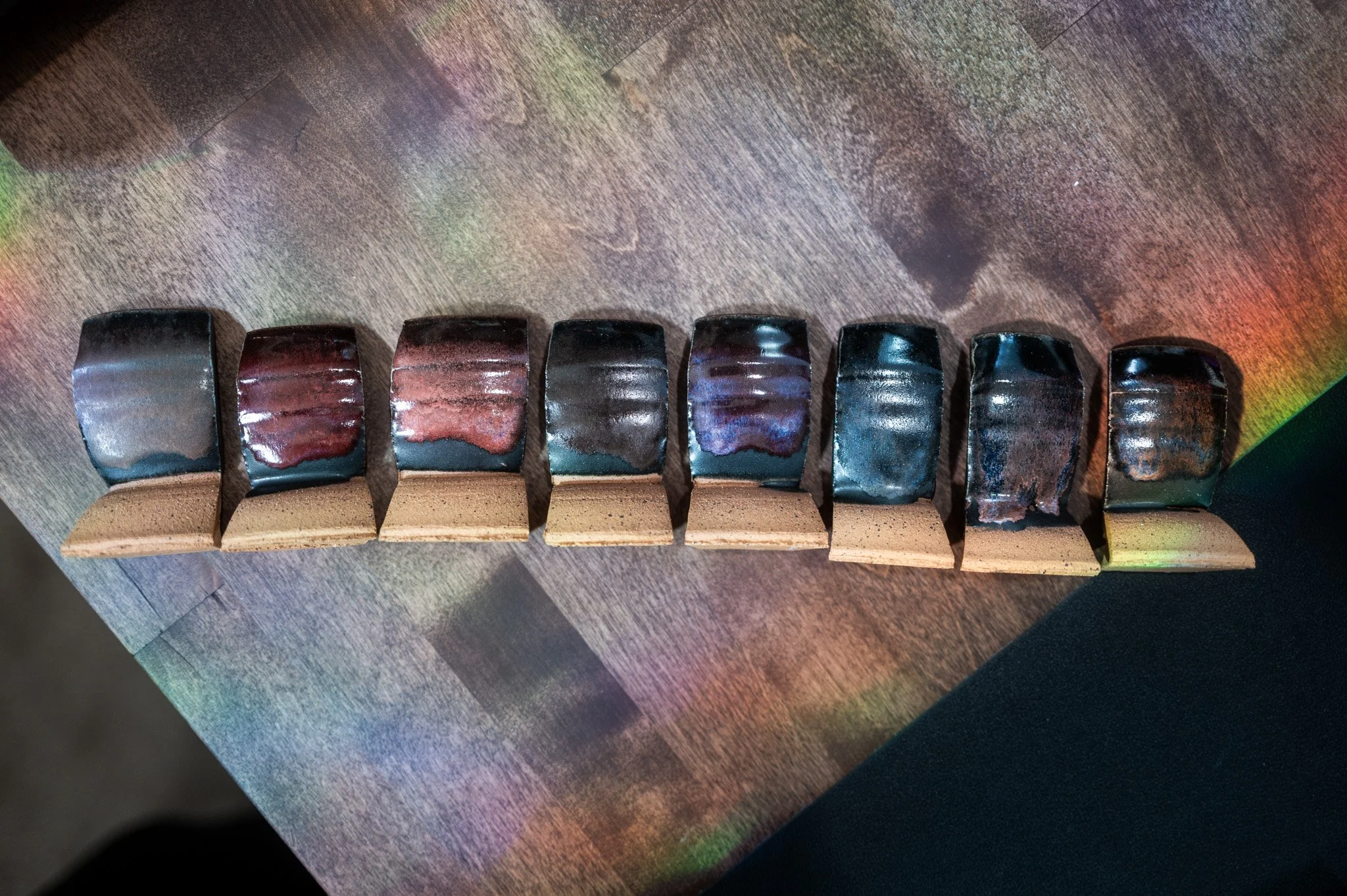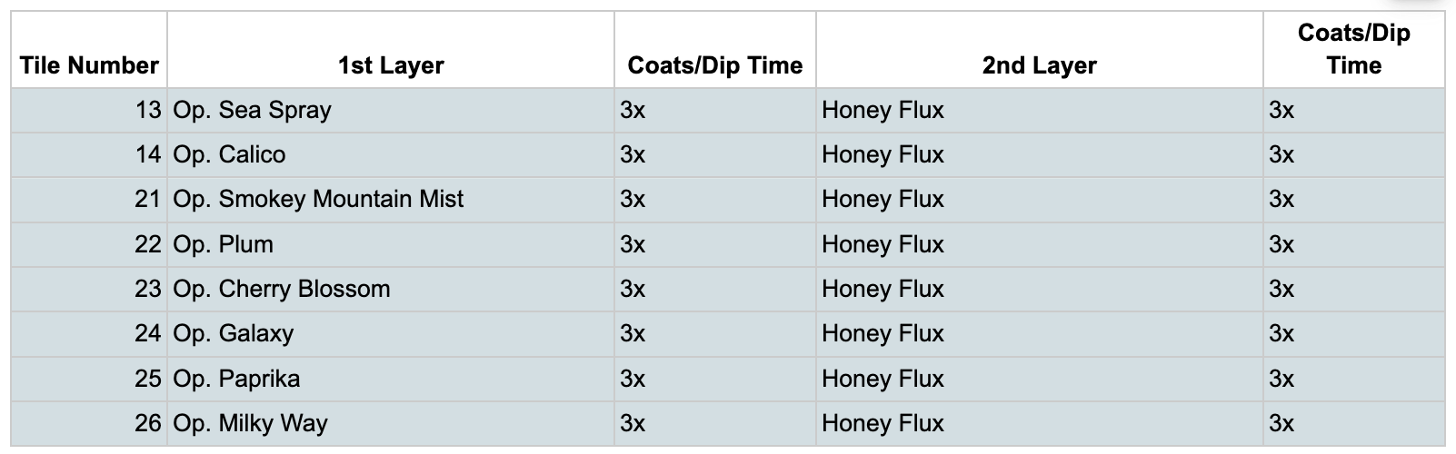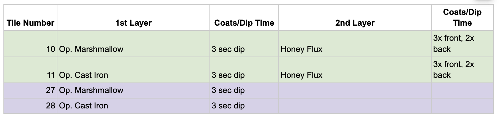 For the Opulence Reduction Look glazes, I ran a consistent series of tests so I could see how they behaved with the two dipping glazes I have for layering (Marshmallow and Cast Iron). For each color, I made four tiles: one with the Reduction Look glaze on its own, one with Honey Flux layered on top, one with Marshmallow on the bottom and the Reduction Look glaze on top, and one with Cast Iron underneath with the Reduction Look glaze layered over it. It was a fun way to see how much variation you can get from the same base glaze.