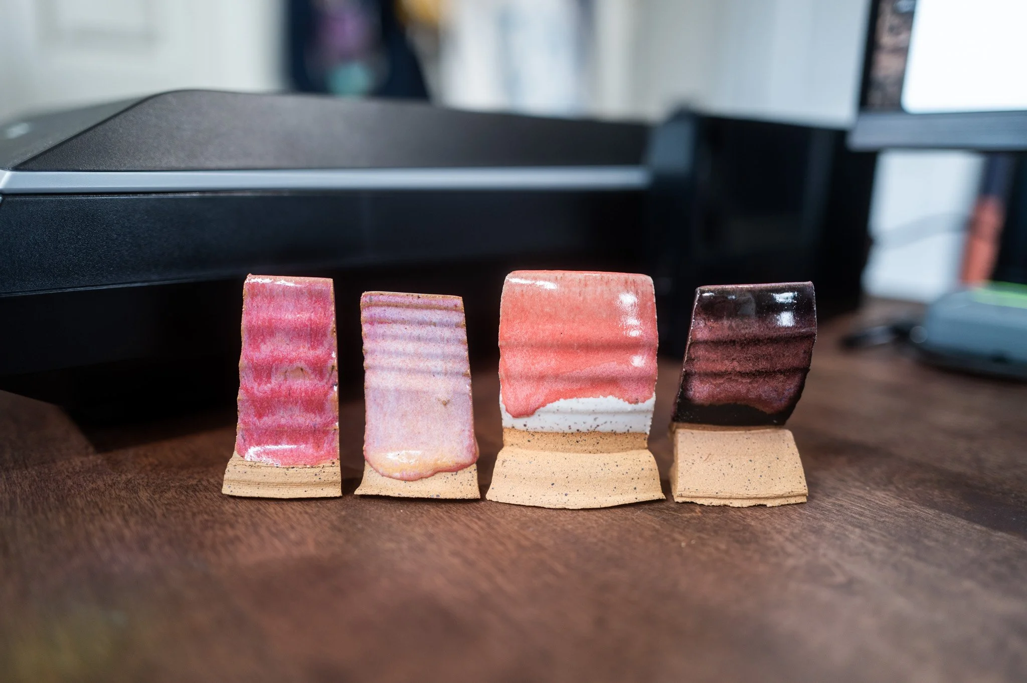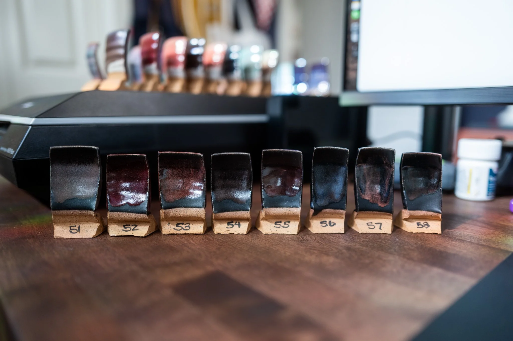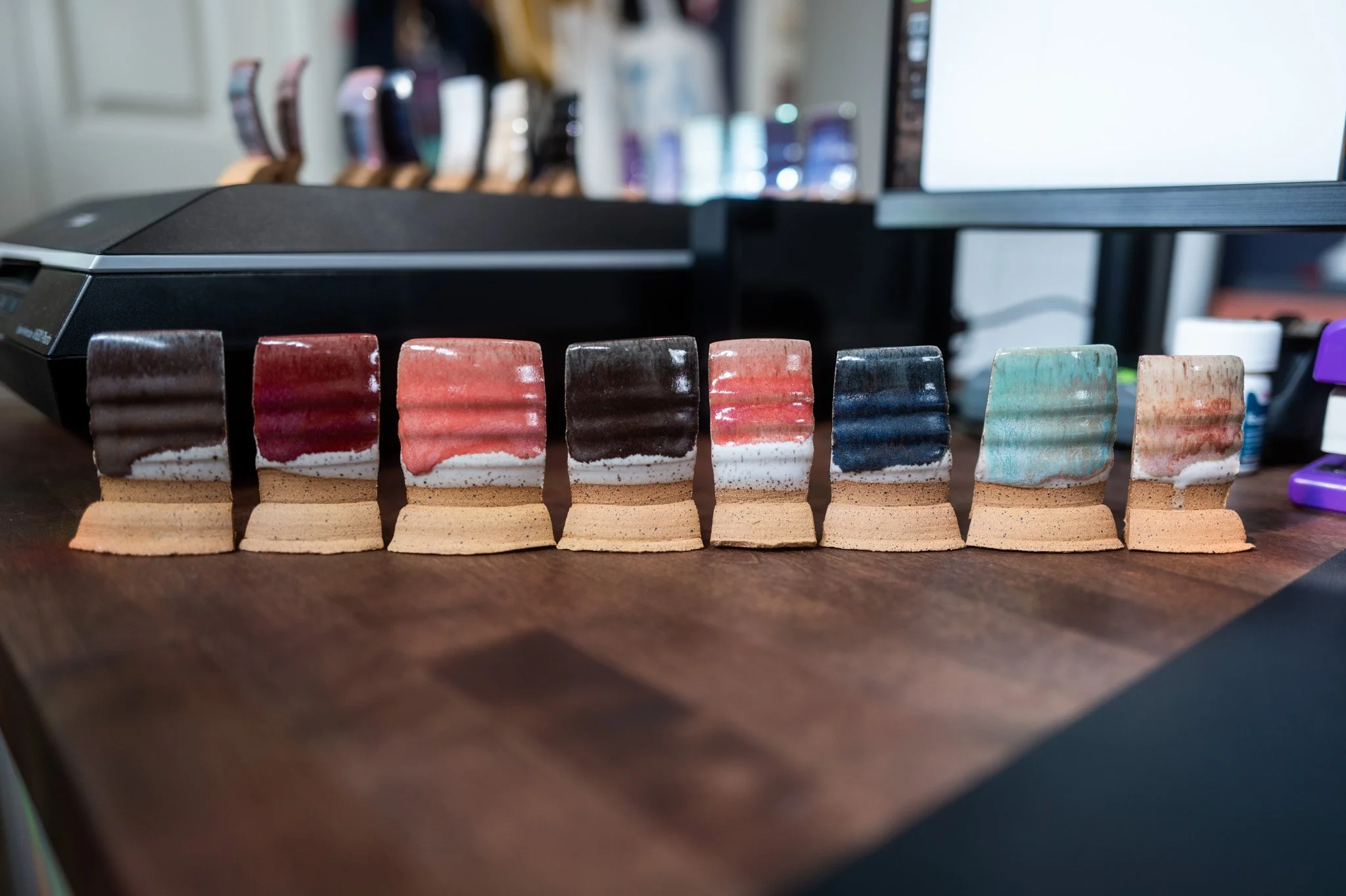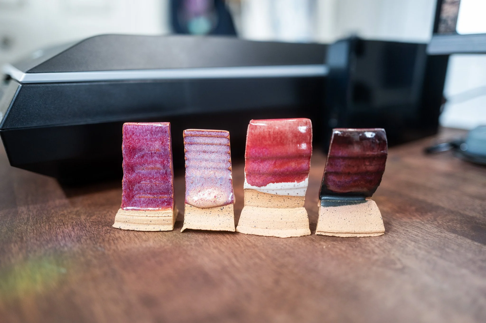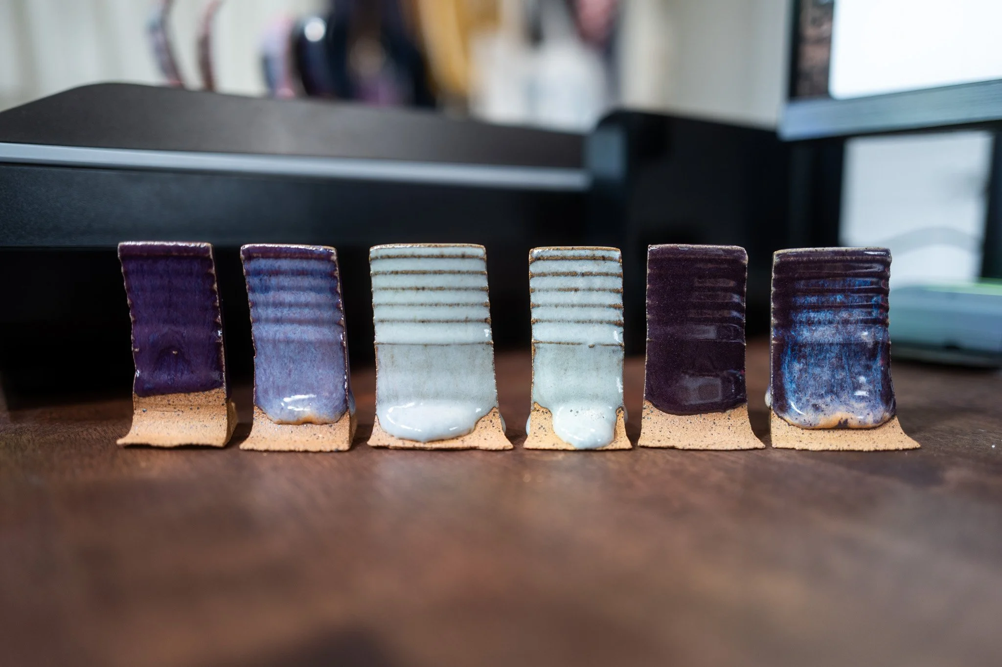 For the Opulence Reduction Look glazes, I ran a consistent series of tests so I could see how they behaved with the two dipping glazes I have for layering (Marshmallow and Cast Iron). For each color, I made four tiles: one with the Reduction Look glaze on its own, one with Honey Flux layered on top, one with Marshmallow on the bottom and the Reduction Look glaze on top, and one with Cast Iron underneath with the Reduction Look glaze layered over it. It was a fun way to see how much variation you can get from the same base glaze.