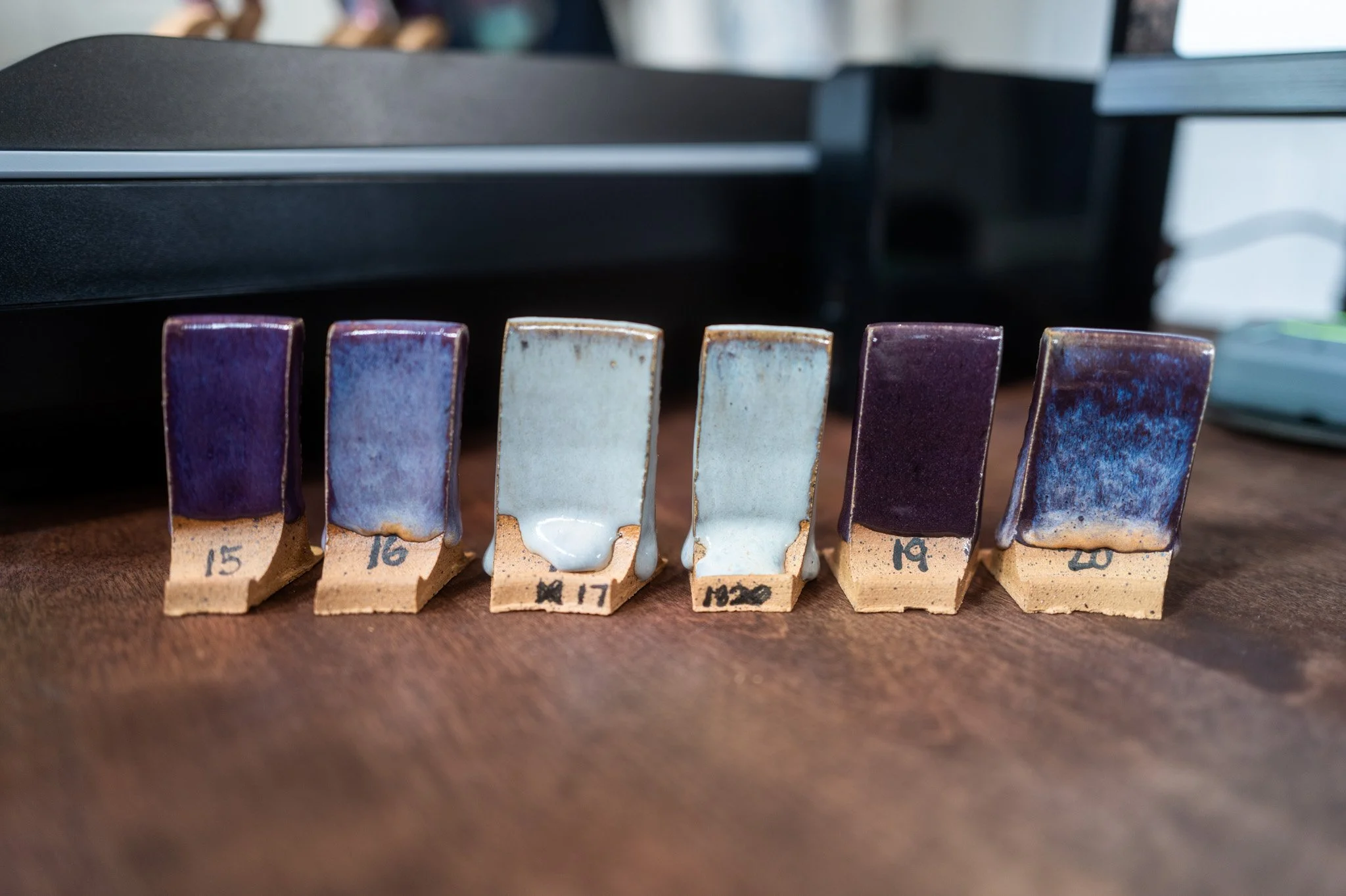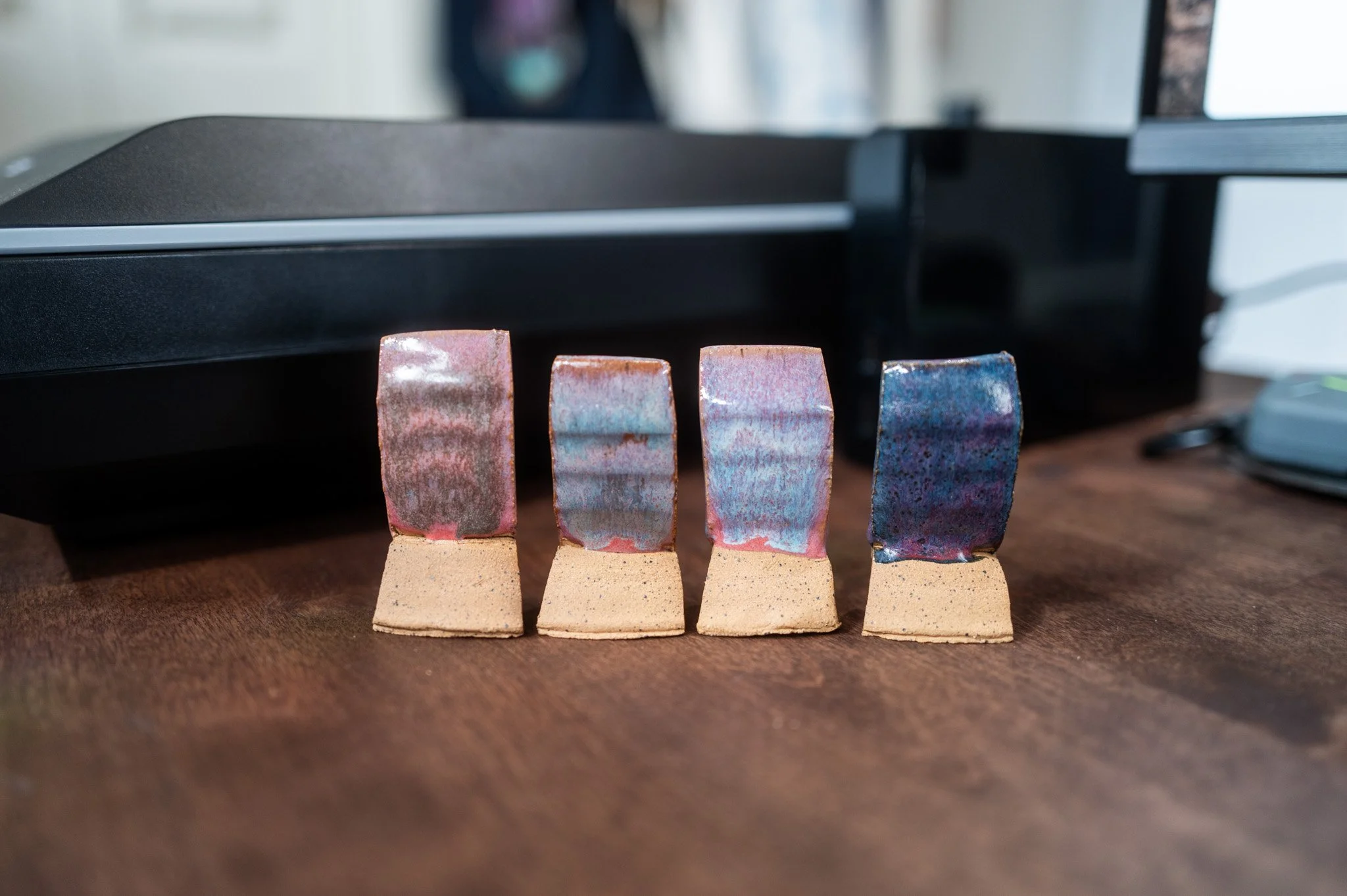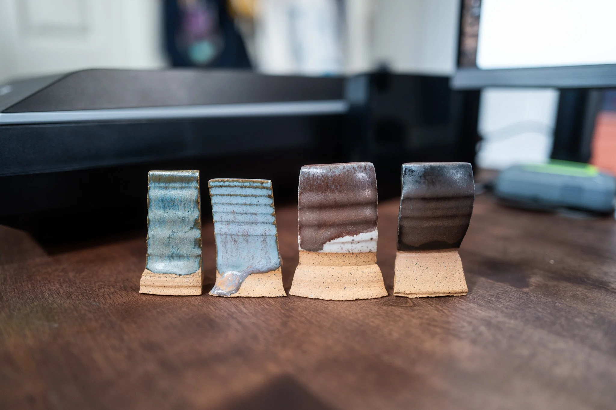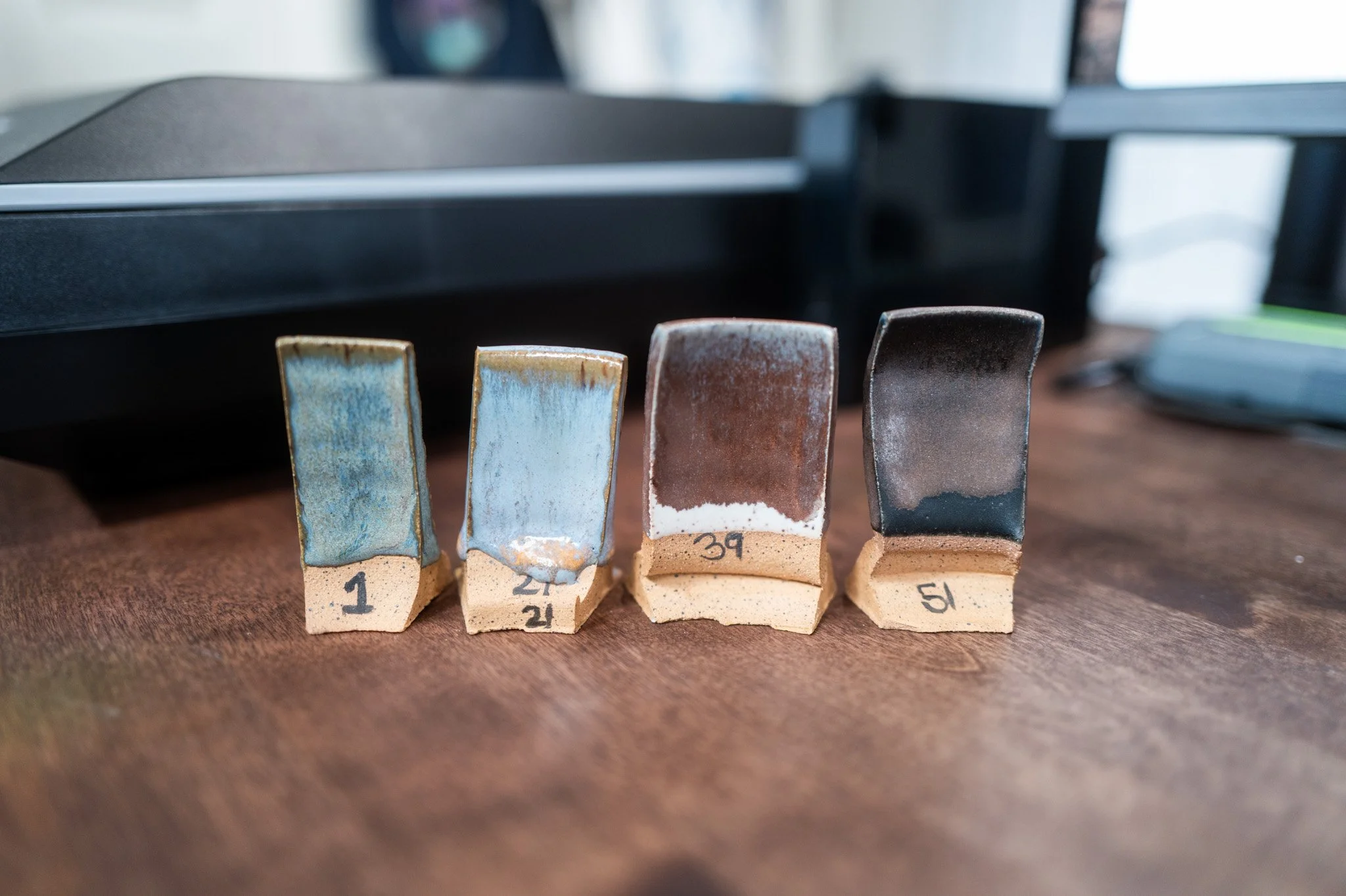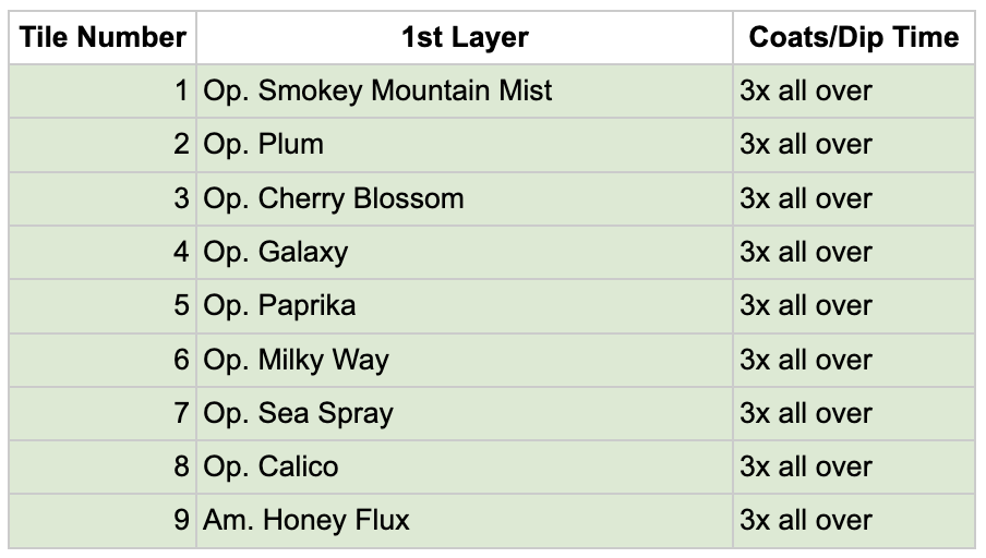 For the Opulence Reduction Look glazes, I ran a consistent series of tests so I could see how they behaved with the two dipping glazes I have for layering (Marshmallow and Cast Iron). For each color, I made four tiles: one with the Reduction Look glaze on its own, one with Honey Flux layered on top, one with Marshmallow on the bottom and the Reduction Look glaze on top, and one with Cast Iron underneath with the Reduction Look glaze layered over it. It was a fun way to see how much variation you can get from the same base glaze.