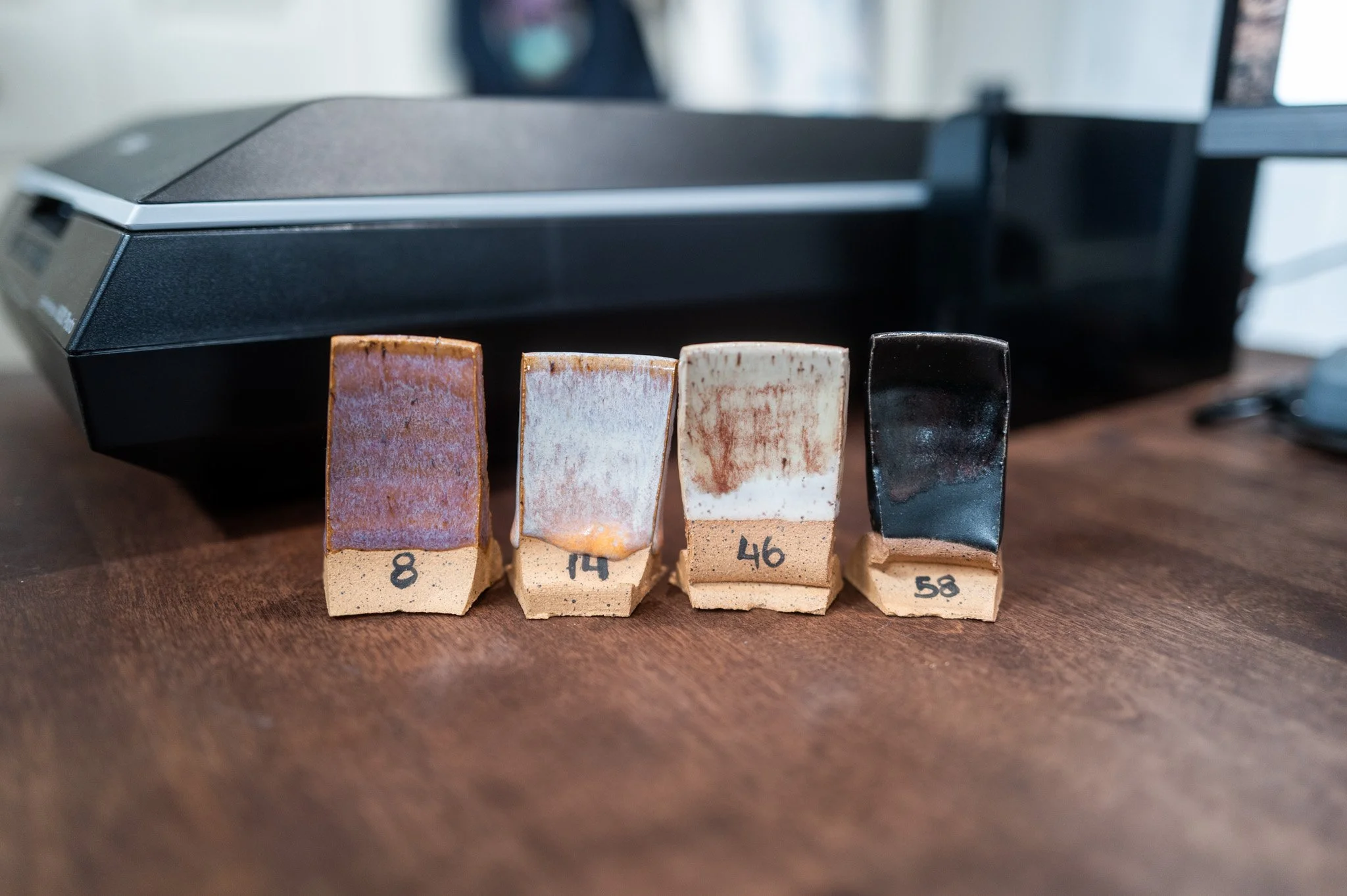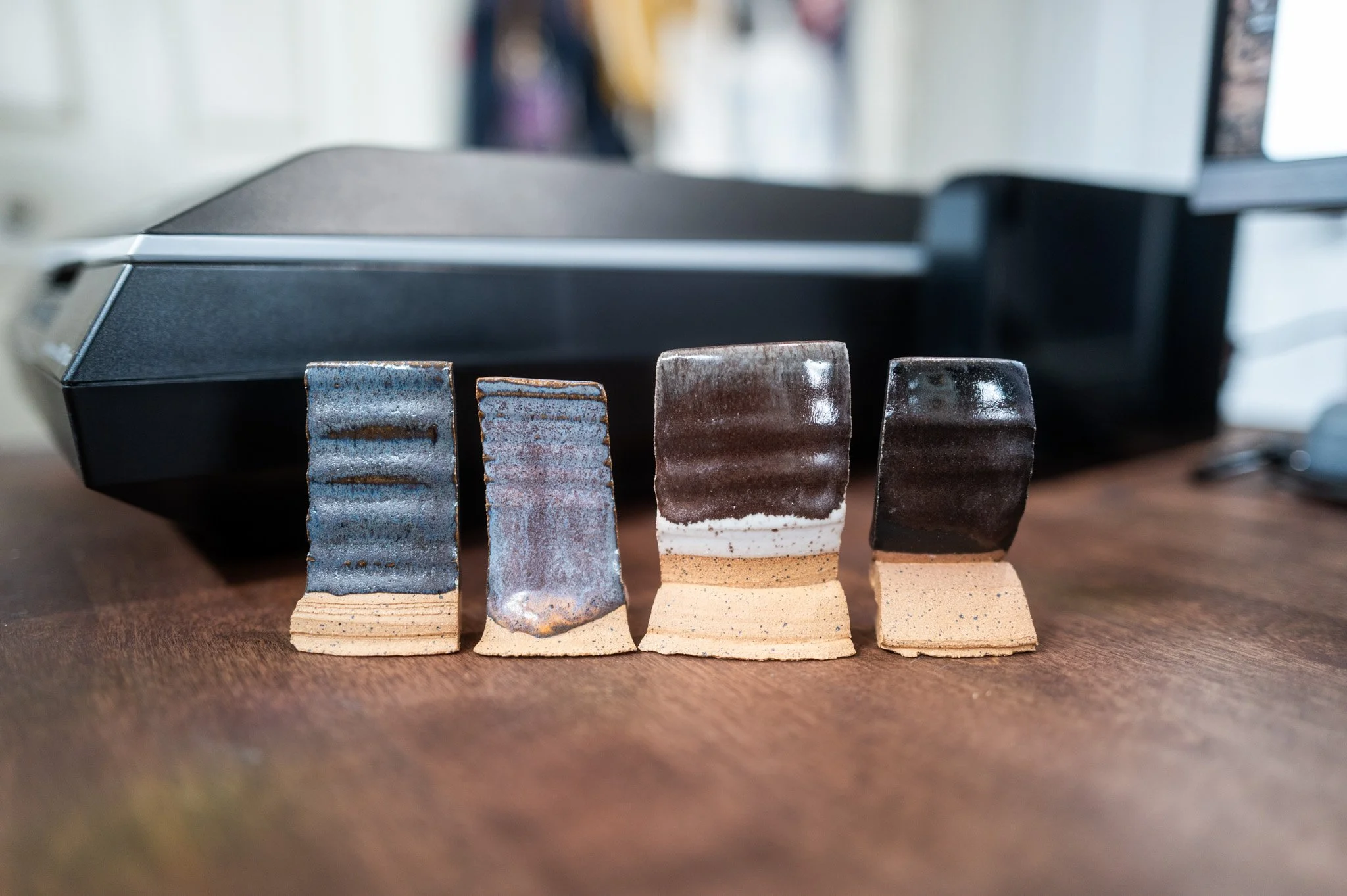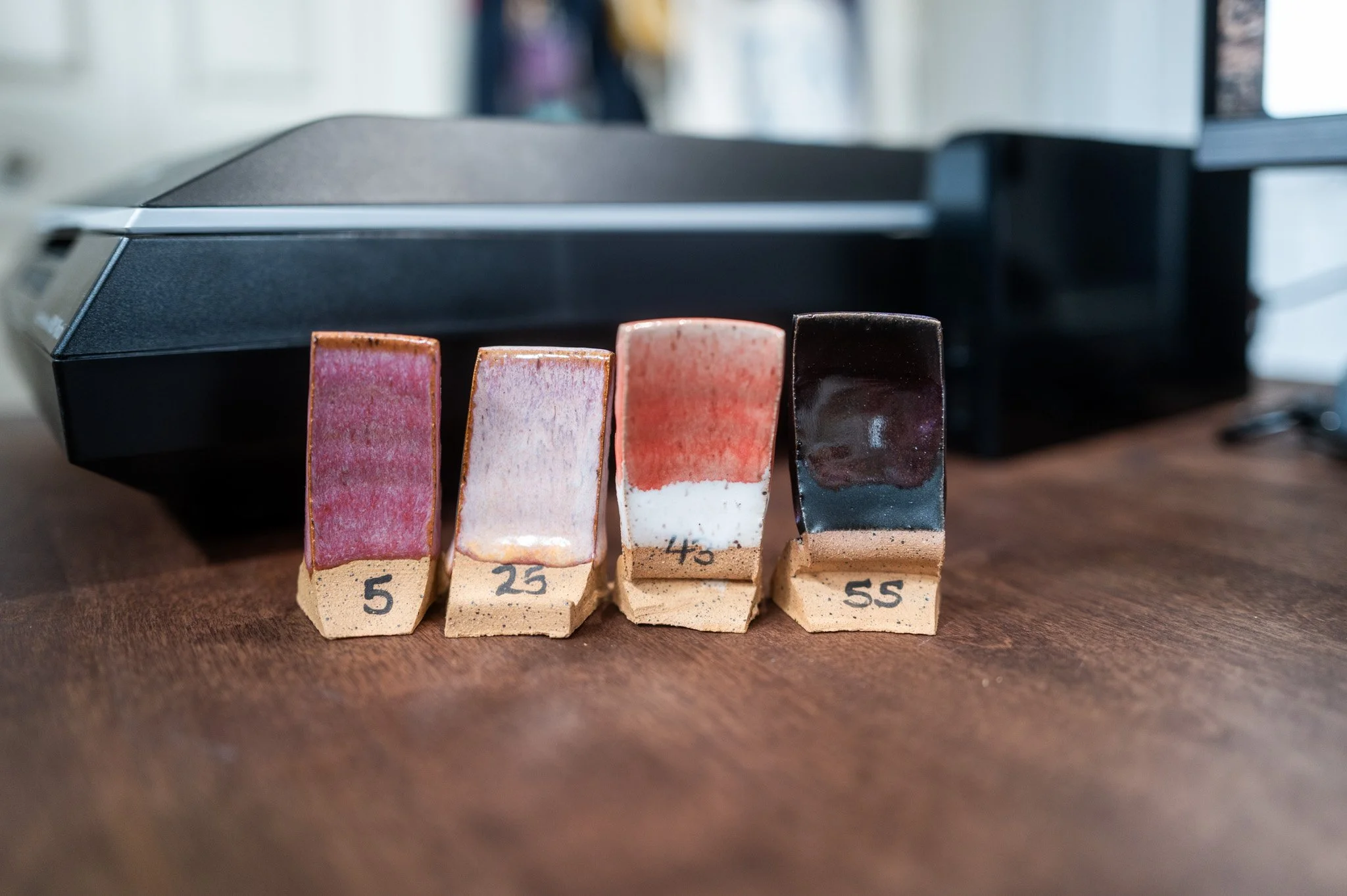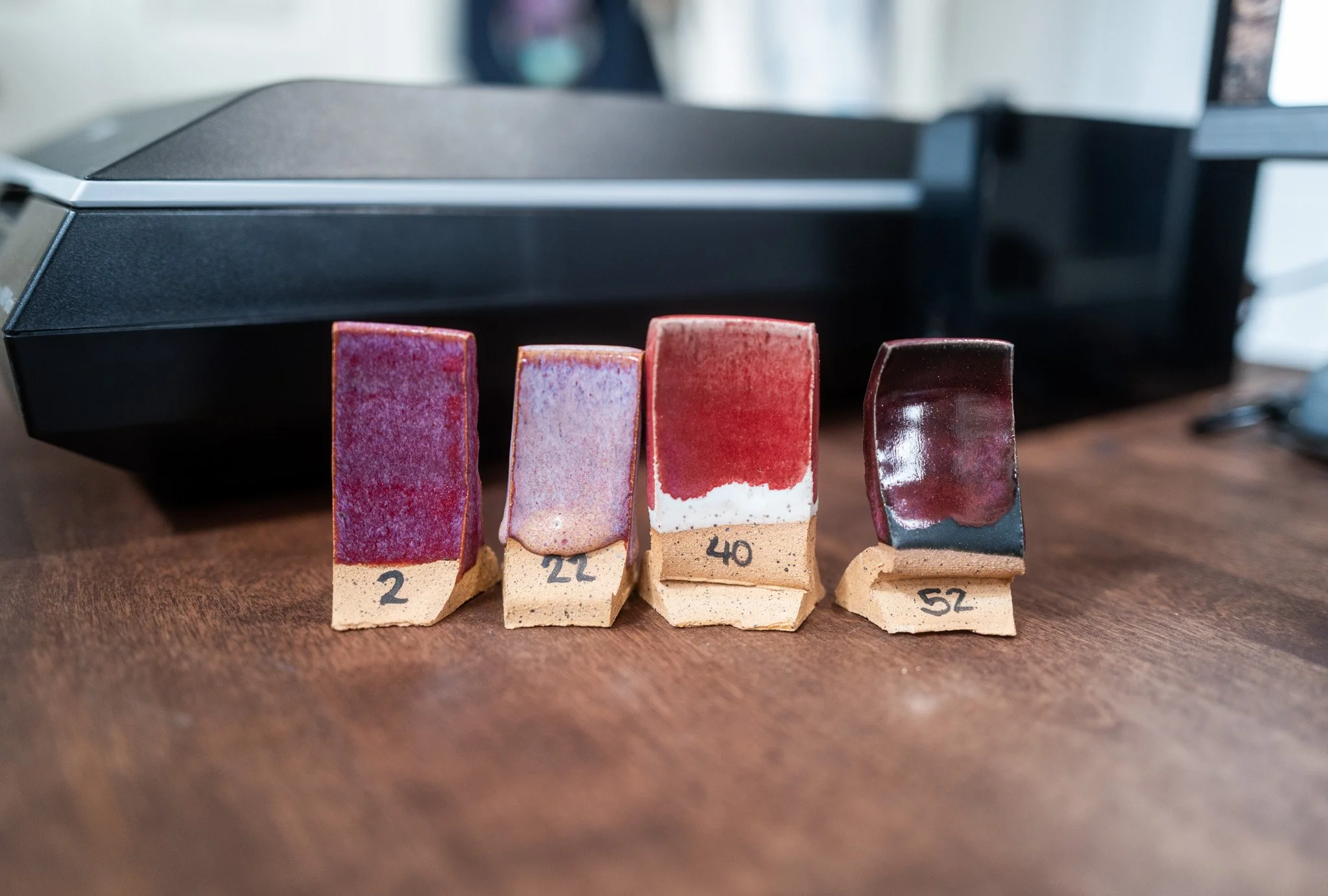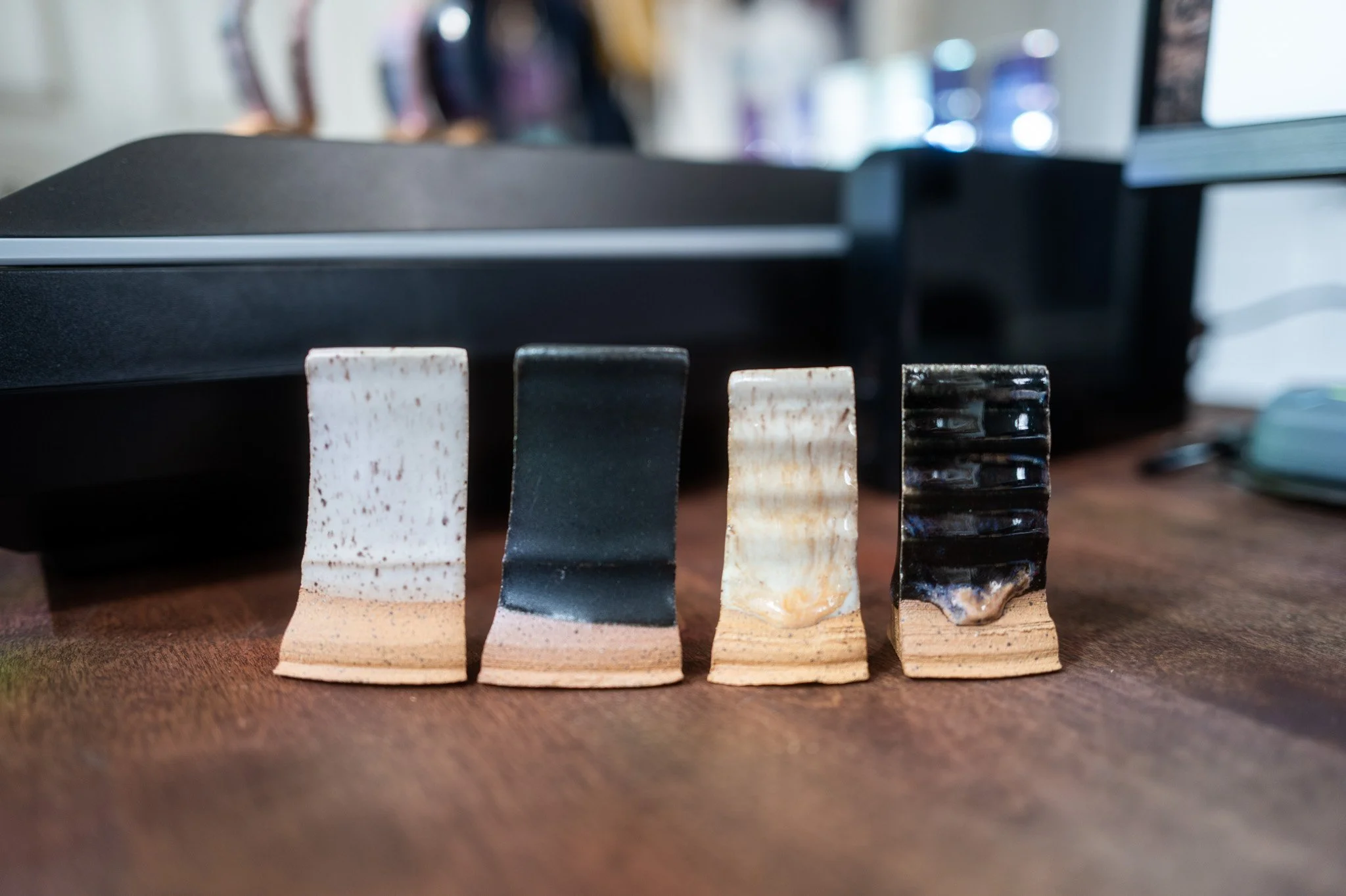 For the Opulence Reduction Look glazes, I ran a consistent series of tests so I could see how they behaved with the two dipping glazes I have for layering (Marshmallow and Cast Iron). For each color, I made four tiles: one with the Reduction Look glaze on its own, one with Honey Flux layered on top, one with Marshmallow on the bottom and the Reduction Look glaze on top, and one with Cast Iron underneath with the Reduction Look glaze layered over it. It was a fun way to see how much variation you can get from the same base glaze.