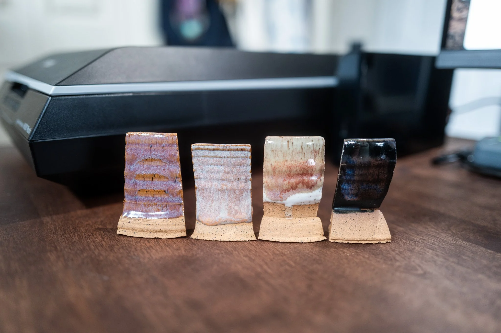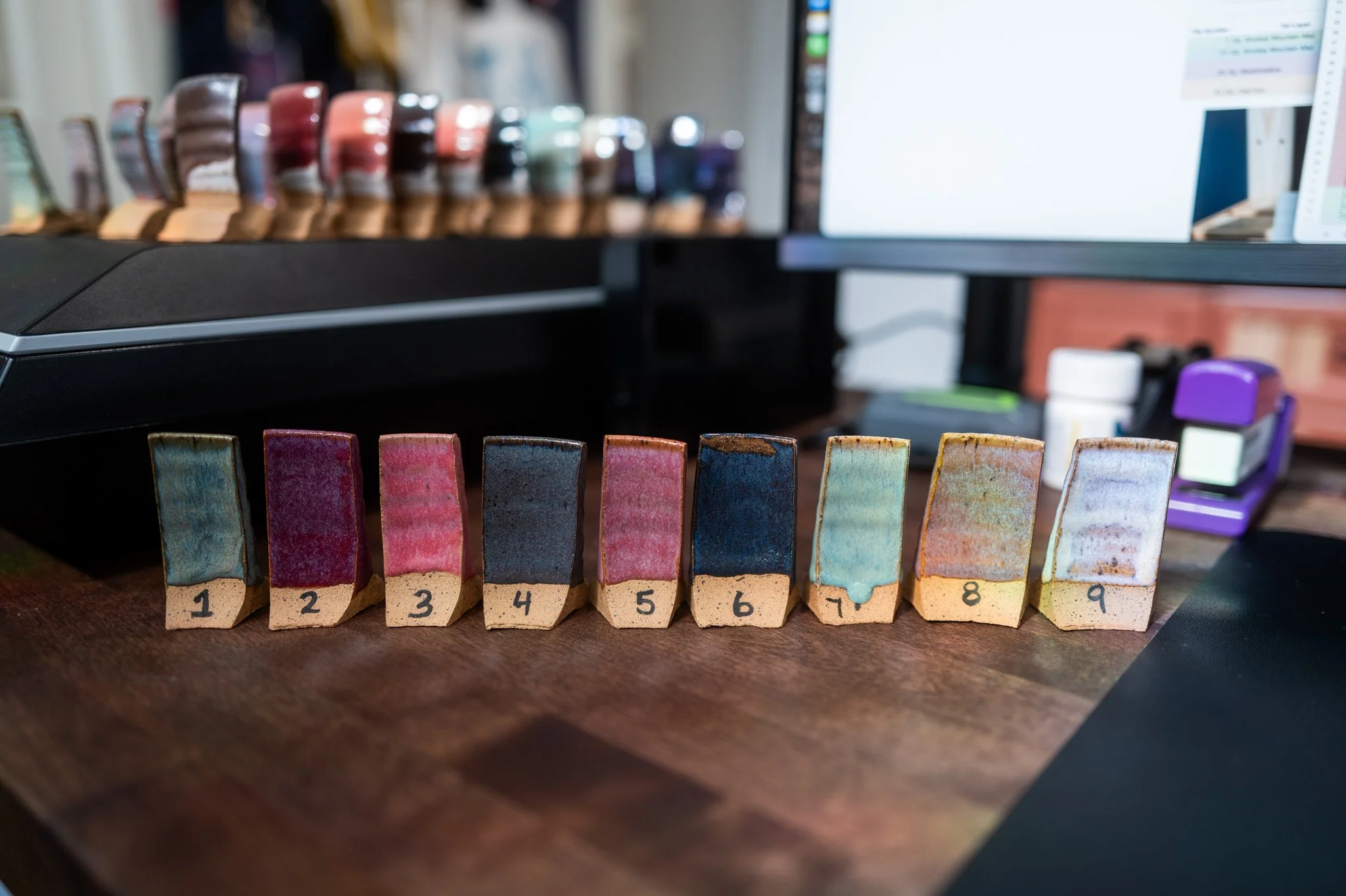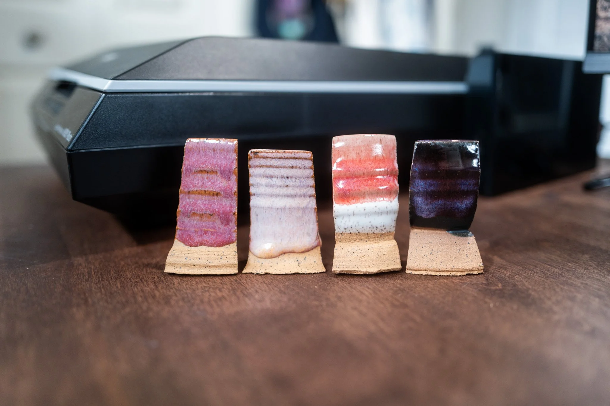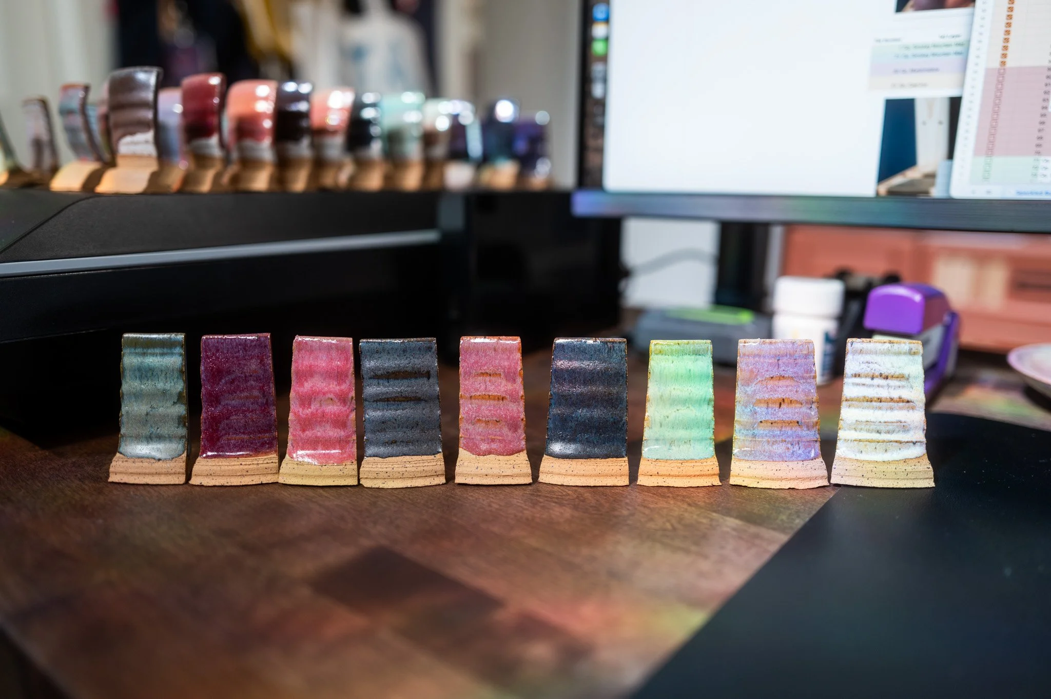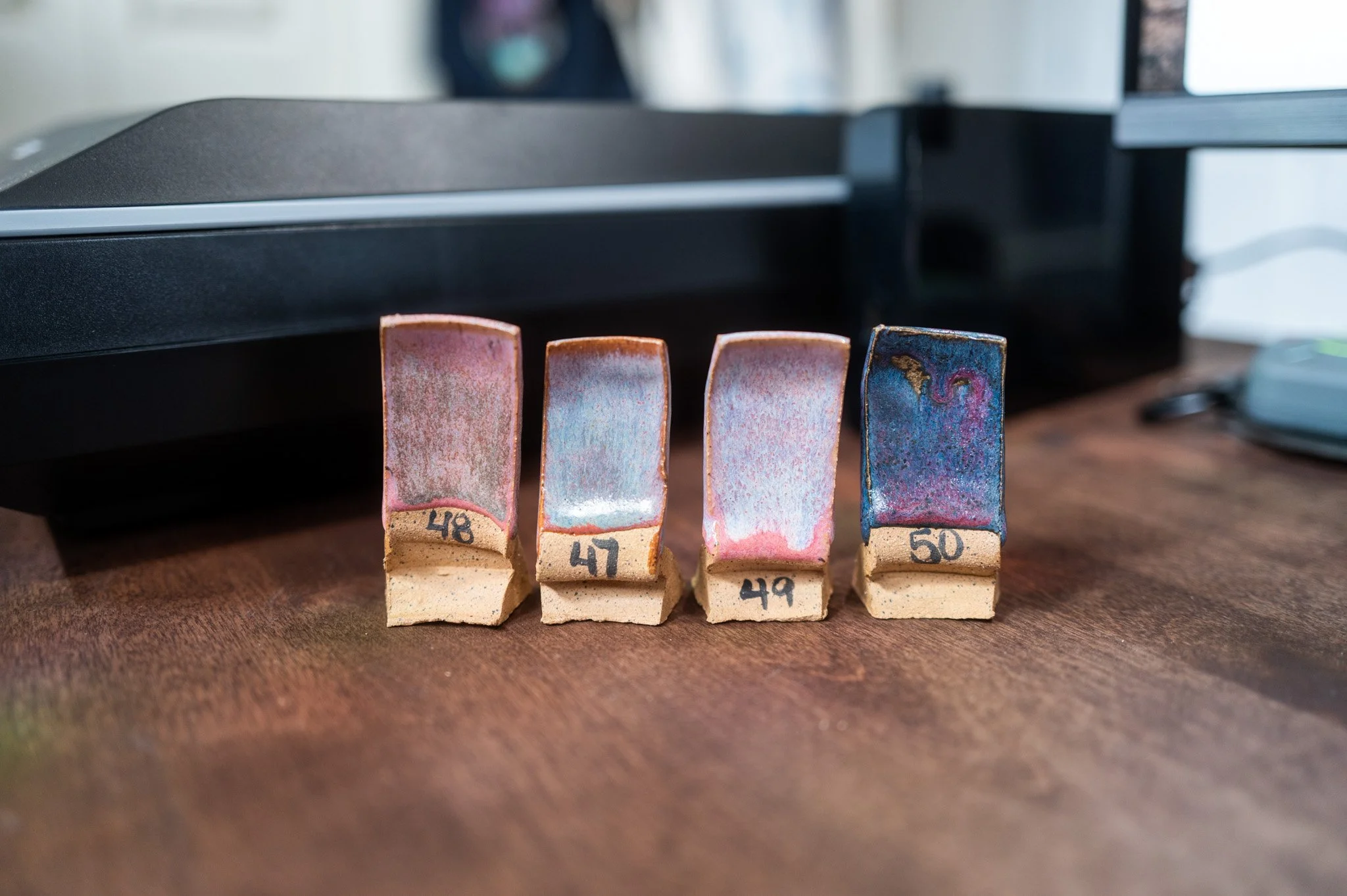 For the Opulence Reduction Look glazes, I ran a consistent series of tests so I could see how they behaved with the two dipping glazes I have for layering (Marshmallow and Cast Iron). For each color, I made four tiles: one with the Reduction Look glaze on its own, one with Honey Flux layered on top, one with Marshmallow on the bottom and the Reduction Look glaze on top, and one with Cast Iron underneath with the Reduction Look glaze layered over it. It was a fun way to see how much variation you can get from the same base glaze.