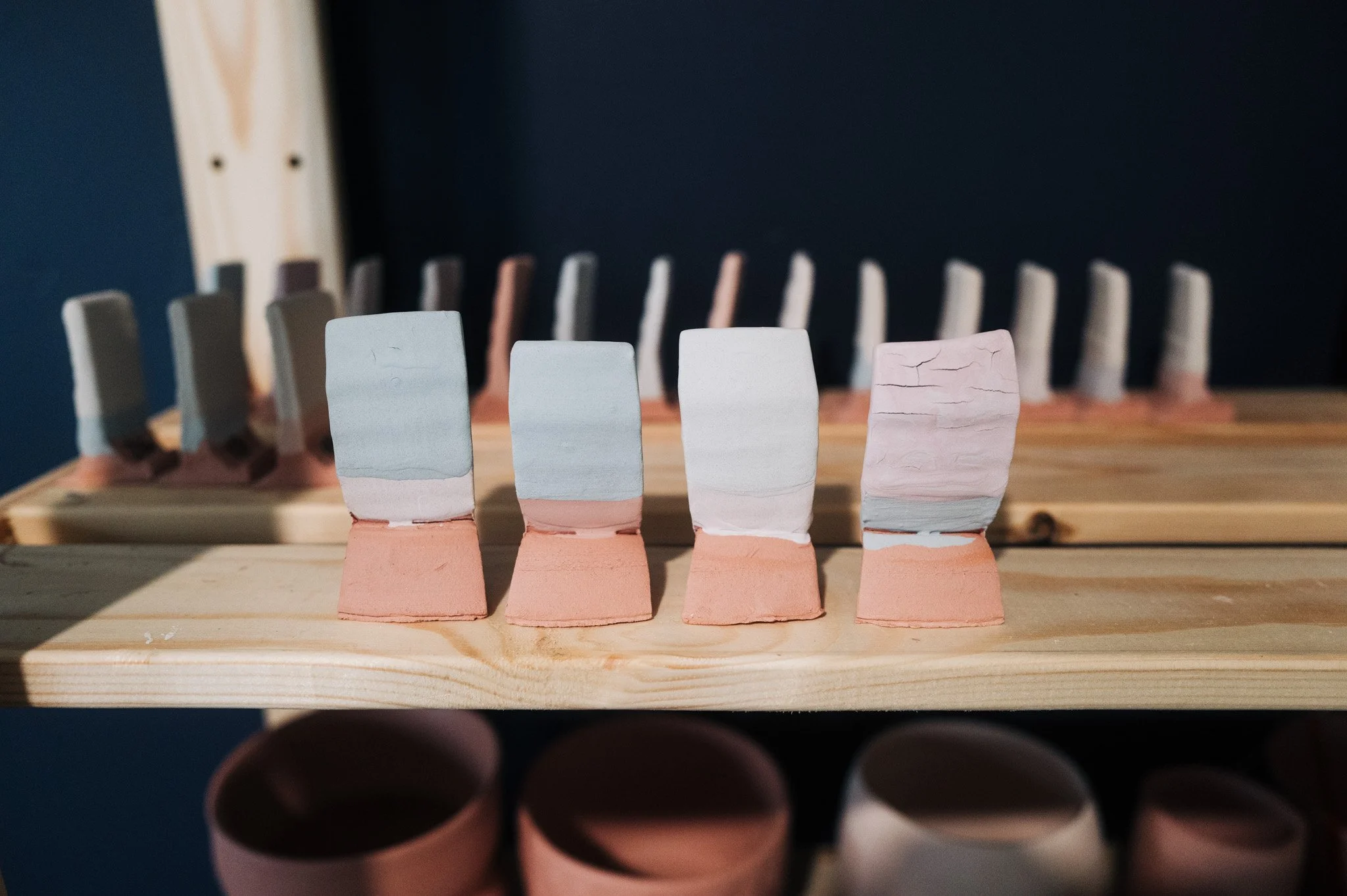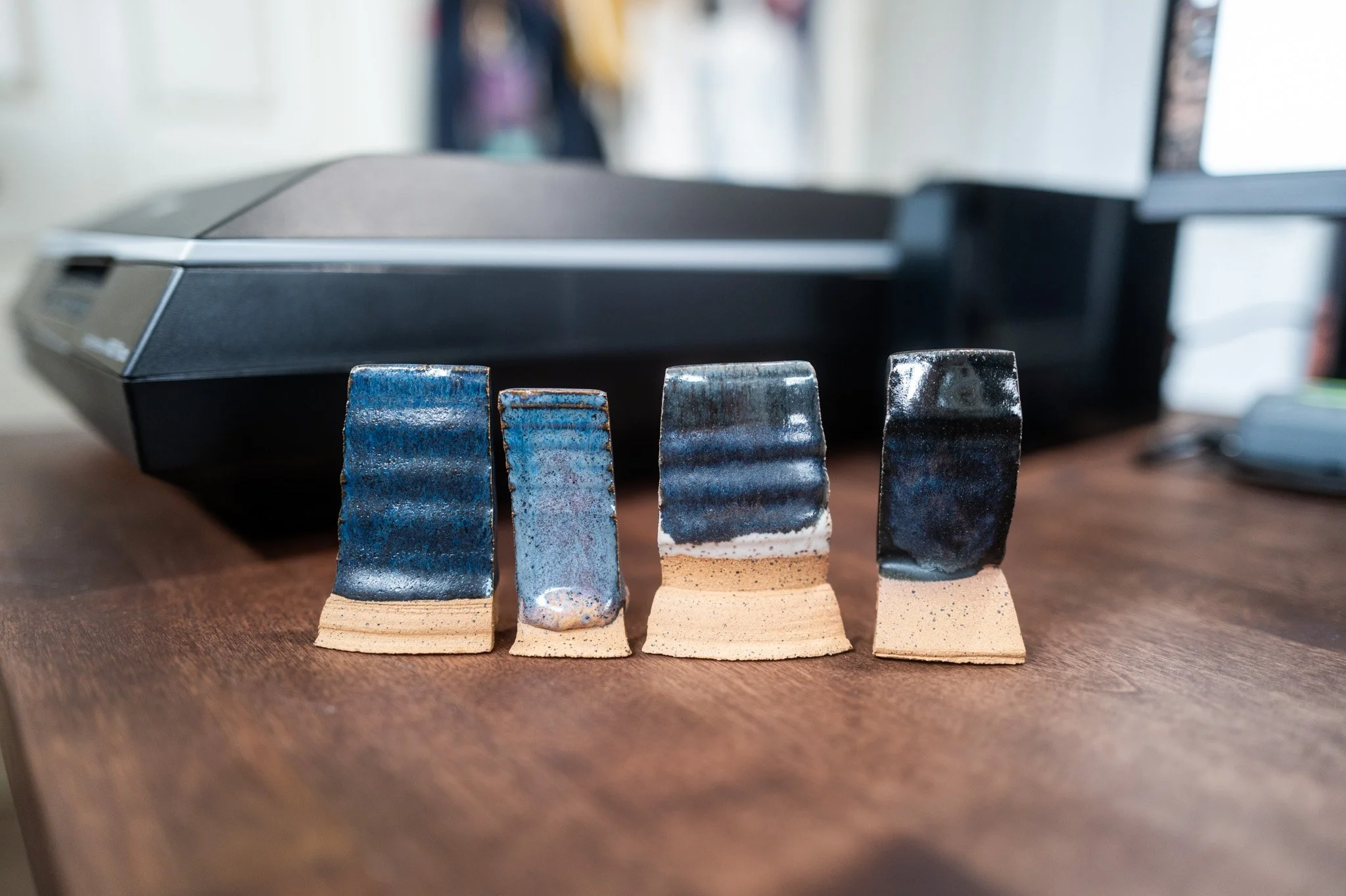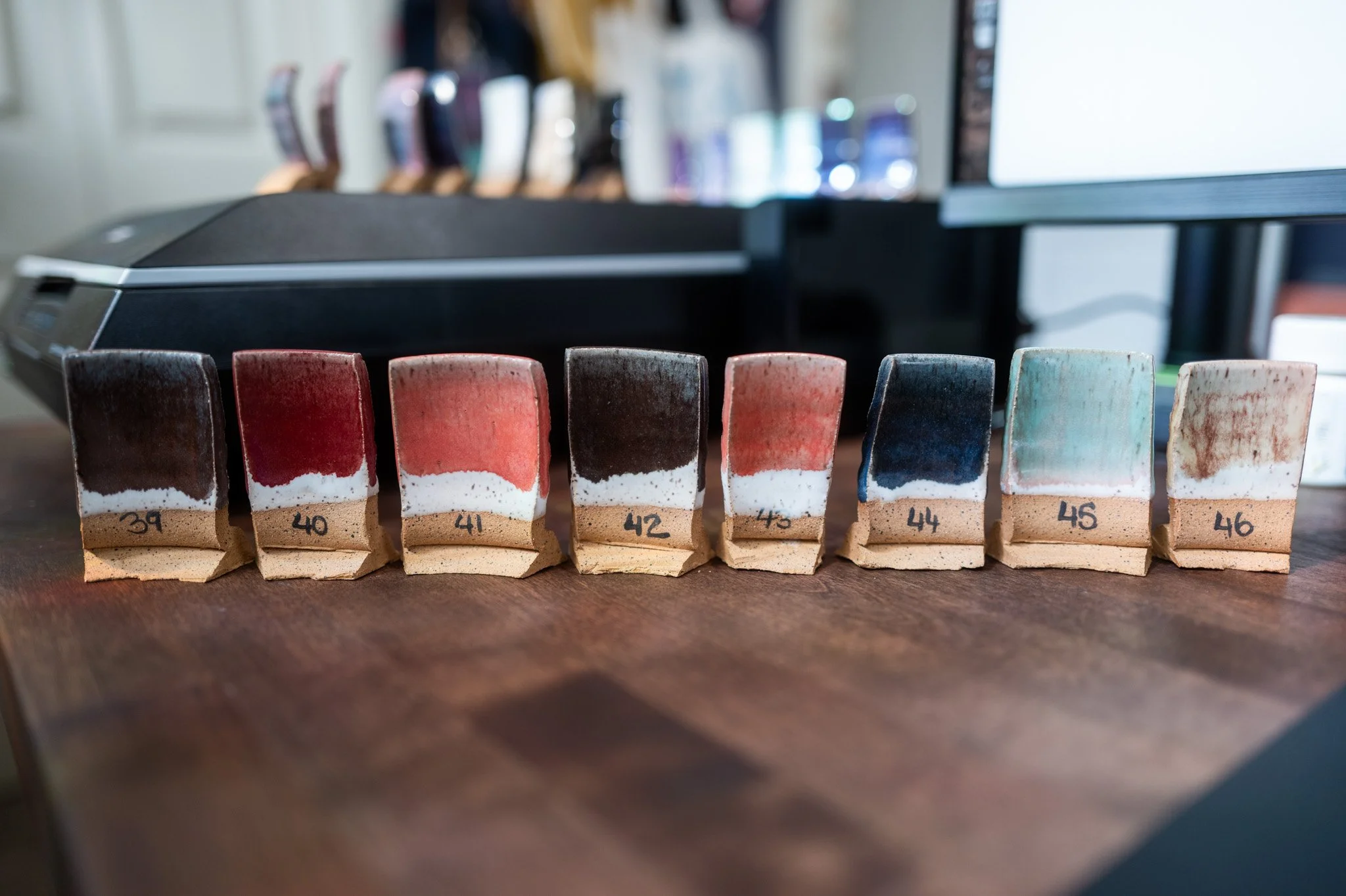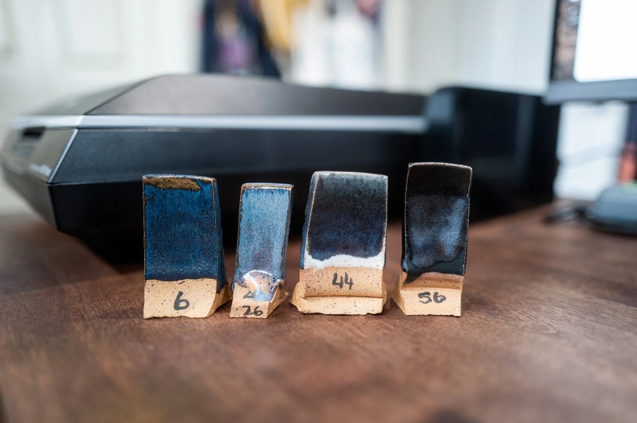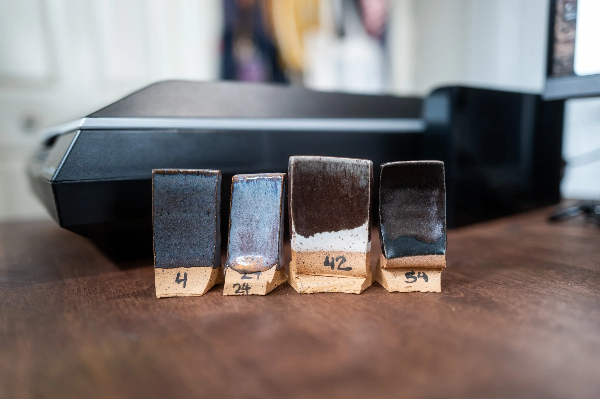 For the Opulence Reduction Look glazes, I ran a consistent series of tests so I could see how they behaved with the two dipping glazes I have for layering (Marshmallow and Cast Iron). For each color, I made four tiles: one with the Reduction Look glaze on its own, one with Honey Flux layered on top, one with Marshmallow on the bottom and the Reduction Look glaze on top, and one with Cast Iron underneath with the Reduction Look glaze layered over it. It was a fun way to see how much variation you can get from the same base glaze.