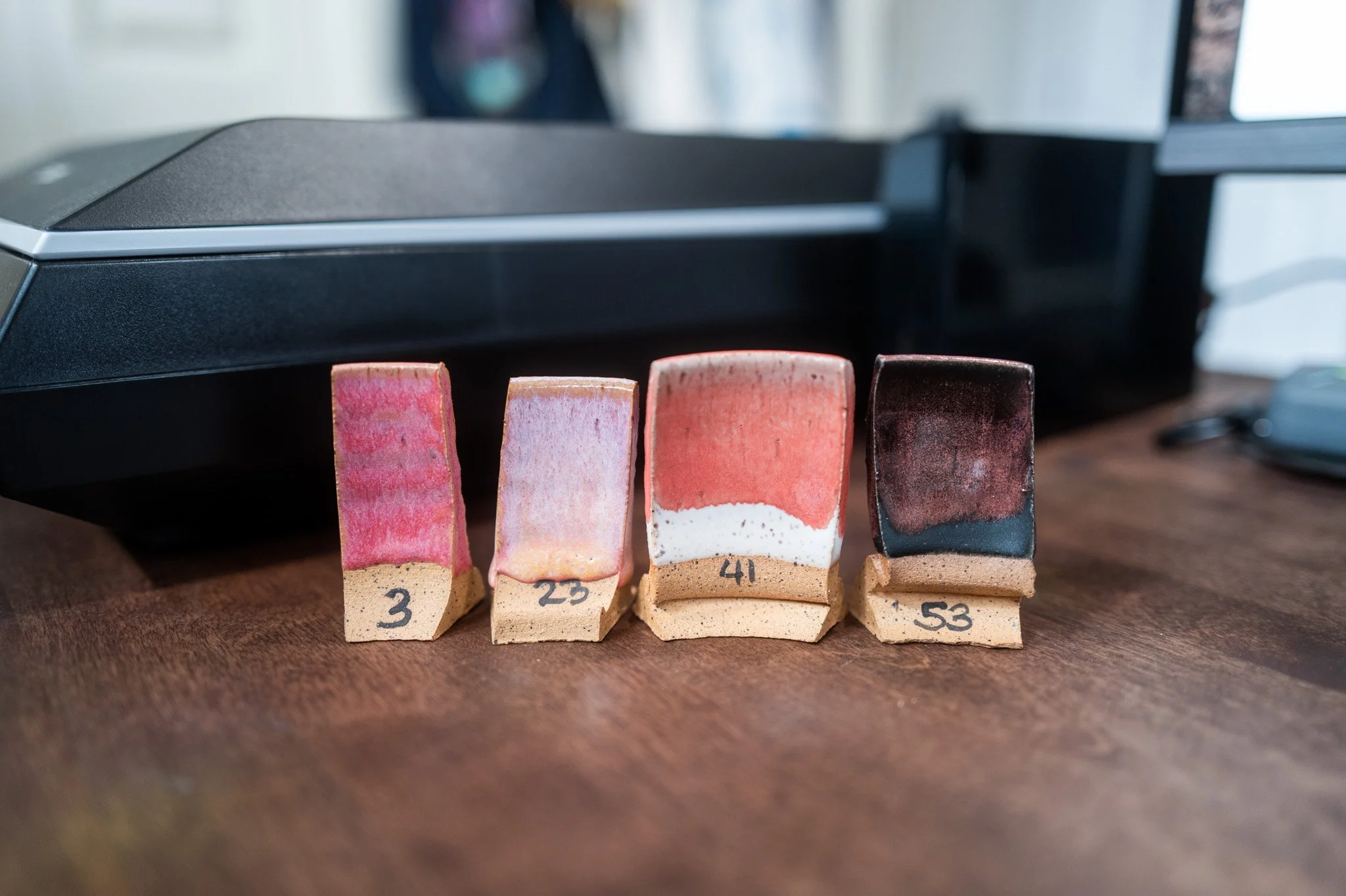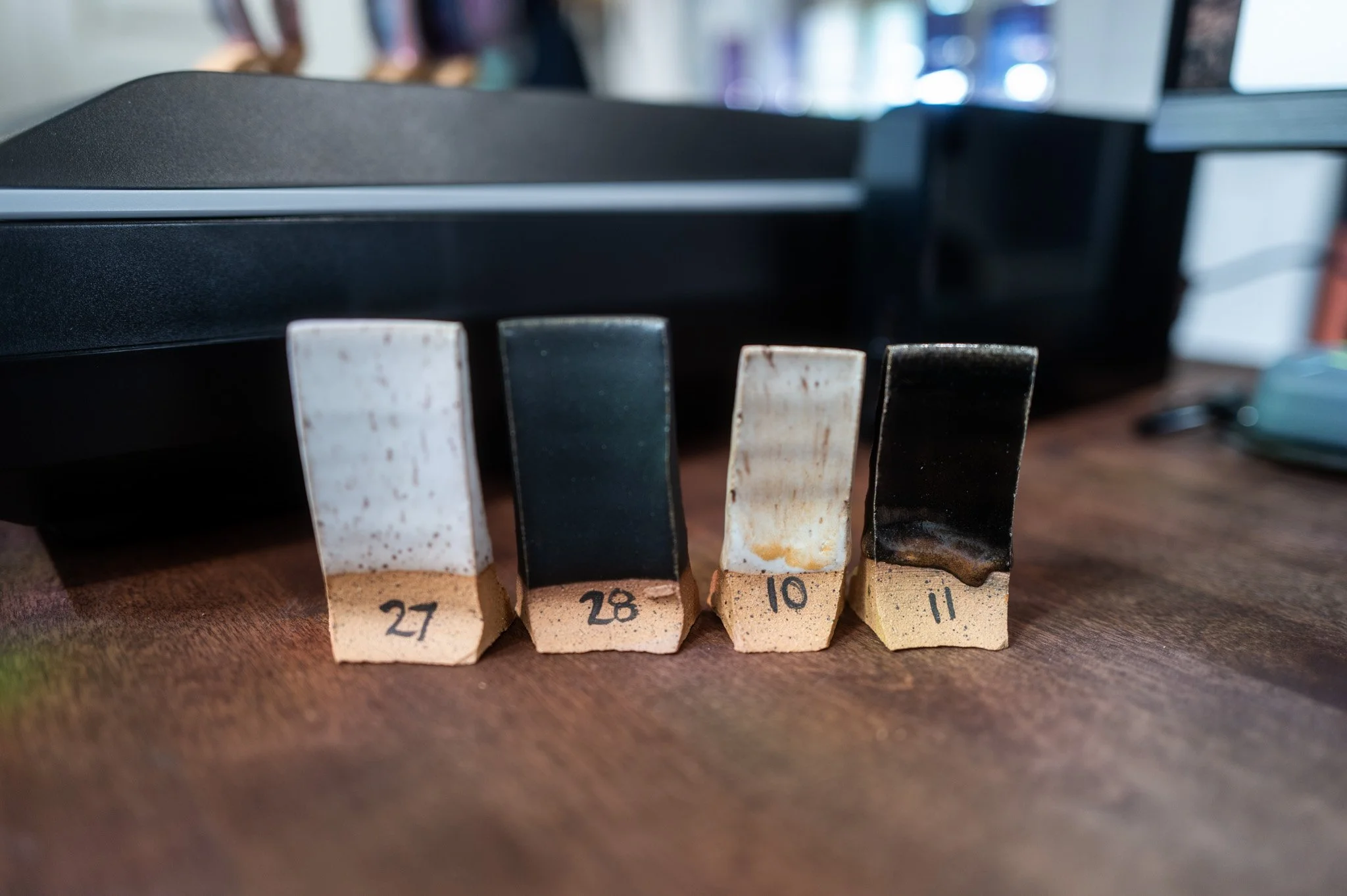 When I first started this pottery journey, I invested in a whole lineup of Penguin Pottery and Opulence glazes. At the time, though, I was firing in a community kiln, and I didn’t want to go through the effort of making test tiles until I had a more permanent firing setup figured out. Now that I do… test tiles were the very first thing on my to-do list.