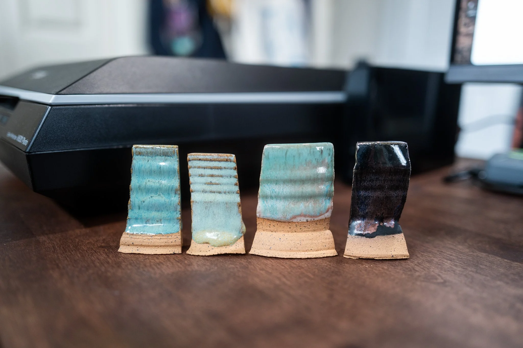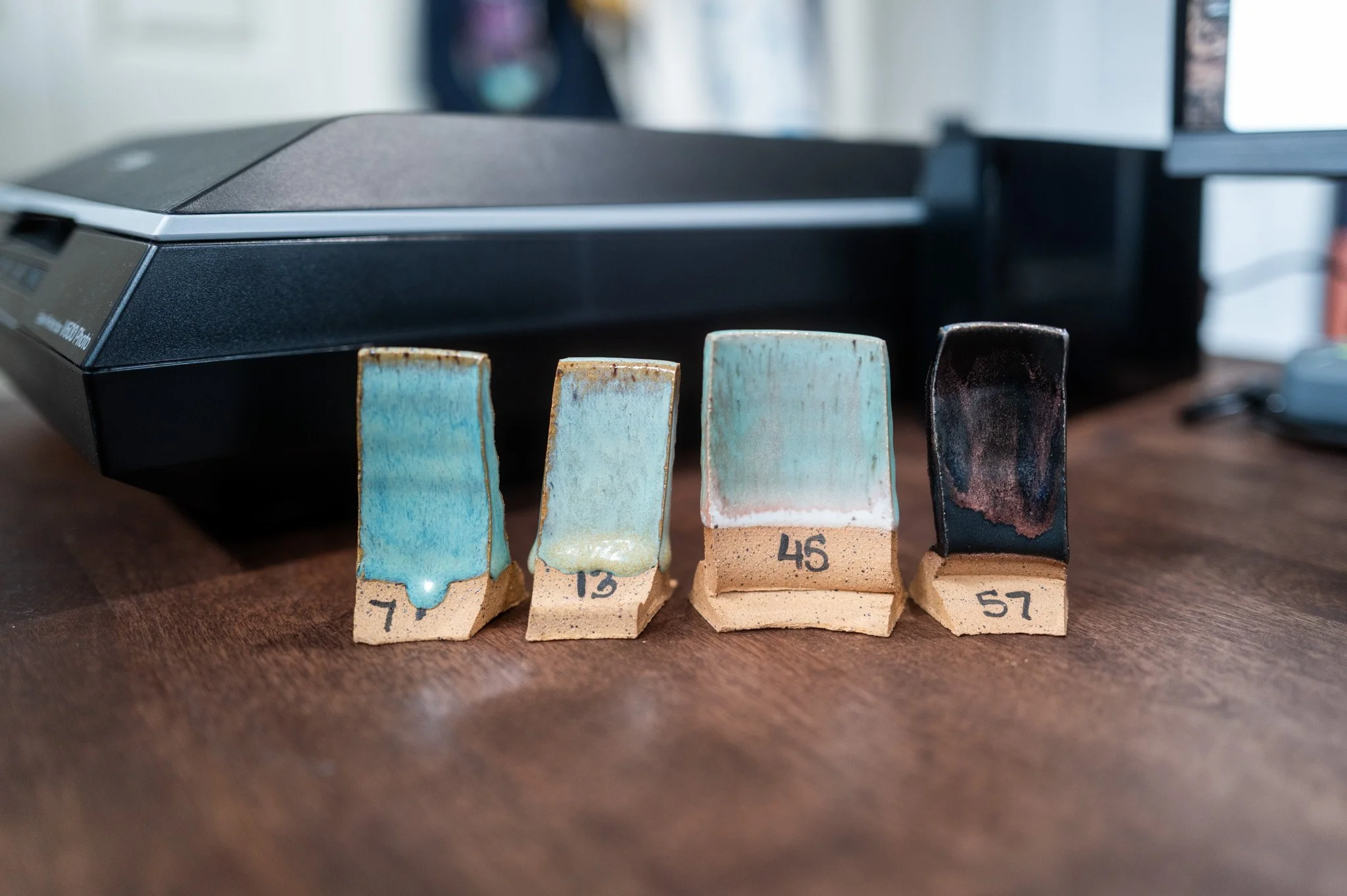 So, in the spirit of sharing with the pottery community, I’m documenting all of the glaze combinations and exactly what I did on each tile. Aside from correcting the white balance, these photos are completely unedited — what you see here is a true representation of how these glazes fired.